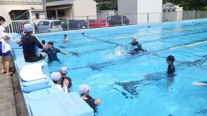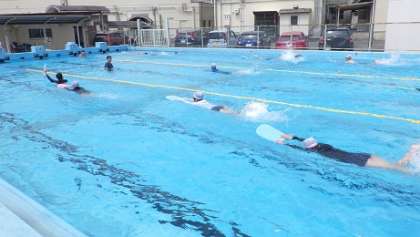 水泳の時間です。ビート版を利用してクロールのキック(バタ足)の練習をしました。