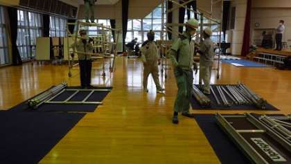 多目的ホールの電気をLEDに変える工事をしていただいています。業者の方の人数の多さに少し驚いています。
