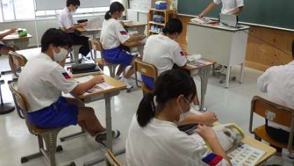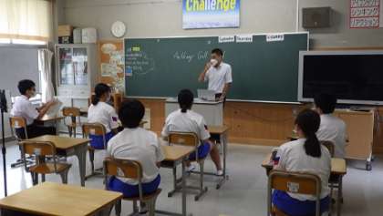 英国ダービーシャーの学校との交流を盛り込んだ単元学習について説明を受けています。実際に会話をする設定もあります。ドキドキわくわくです。
