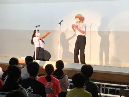 爆笑漫才。かつらをかぶってなりきっています。