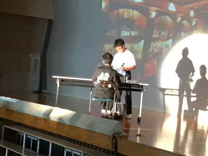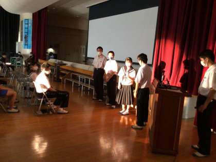 コンビ結成1週間。シュールなコントを披露しました。有志発表のとりは、3年生全員参加の映像でした。見事な歌声と編集でした。
