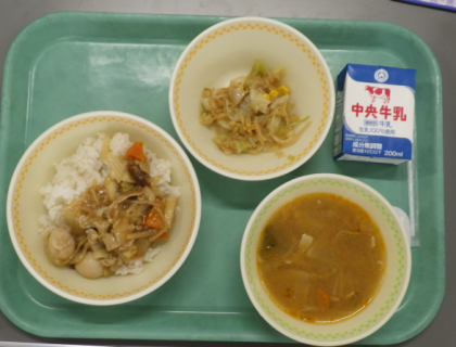 本日は、中華丼、切り干し大根の中華サラダ、キムチスープ、牛乳です。ごちそうさまでした。