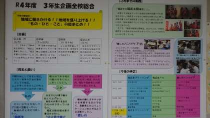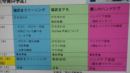 本年度の総合的な学習の時間のテーマは「地域に働きかける・地域を盛り上げる」で、稲武の「ひと・もの・こと」について調べ学習を行い、まとめとして「稲武をPR」「稲武をクリーニング(ごみ拾い)」「癒しのハンドケア(お年寄りとの交流)」を考えています。