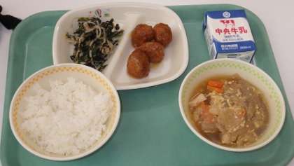本日の献立は「ごはん、愛知の食材入りつくね、のり酢あえ、親子煮、牛乳」計838kcalでした。本日もとっても美味しかったです。ごちそうさまでした。