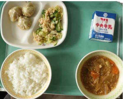 ごはん 牛乳 麻婆大根 小籠包 棒棒鶏 本日は中華です。美味しくいただきます。