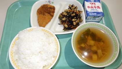 本日の献立は「ごはん、かつおフライ、大豆の磯煮、すまし汁、牛乳」計797kcalでした。かつおフライ、最高に美味しかったです。ごちそうさまでした!