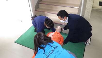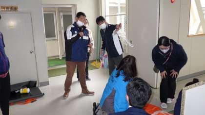後期中間テスト一日目。午後から先生たちは「いざ」という時のために勉強しました。足助消防署稲武出張所から6名の消防士の方をお招きし、シミュレーション研修を行いました。今回は放課に生徒が階段から転げ落ち、意識を失うという設定で状況把握、救急車要請、保護者への連絡など与えられた役割をしっかり果たせたかどうか消防署の方に見ていただきました。反省点を確認し、「もしも」の場合に備えます。しかしこんなことが起きないことが一番です。生徒の皆さんも安心安全な学校生活を心がけてくださいね。