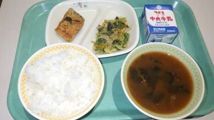 本日の献立は「ごはん、さばの竜田揚げ、ごまあえ、味噌汁、牛乳」計853kcalでした。さばの揚げ具合がバッチリで、とっても美味しかったです。ごちそうさまでした!
