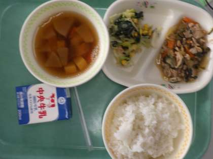 本日は、豚肉のしょうが炒め、小松菜の和え物、八杯汁、牛乳、ごはんでした。今週は日本型食生活習慣の献立でした。ごちそうさまでした。