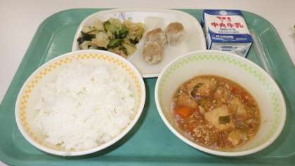 本日の献立は「ごはん、しゅうまい、海藻サラダ、ジャーチャンドウフ、牛乳」計875kcalでした。ジャーチャンドウフは家常豆腐と書き、中国全土で食べられている大変ポピュラーな家庭料理だそうです。とっても美味しかったです。ごちそうさまでした!