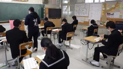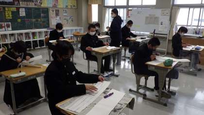 書写の時間でした。いよいよ書き初めに入ります。今年の書き初めは各学年、次のような字を書きます。1年「公明正大」、2年「笑門来福」、そして3年「理想の実現」です。