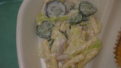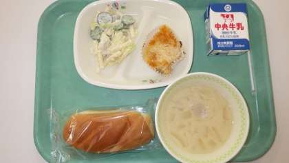 本日の献立は「米粉パン、ポテトグラタン、マカロニサラダ、豆乳スープ、牛乳」計828kcalでした。ポテトグラタン、めっちゃ美味しかったです。ごちそうさまでした!!