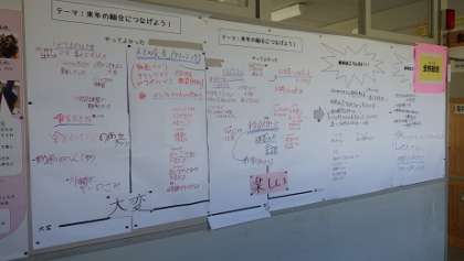 本年度の取組をまとめたものが総合教室前の廊下に掲示してあります。稲武クリーニング、癒しのハンドケア、そして稲武をPRの三つの「取組の成果」と「今後へ向けて」がわかりやすく掲示してあります。まとめの話し合いに活用したメモも掲示してあります。この取組、ぜひ稲中の新たな伝統として受け継がれていくとよいと思います。