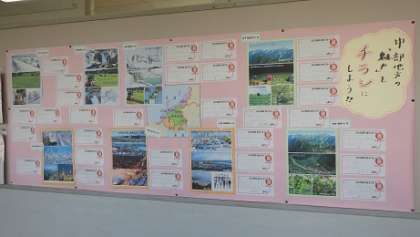 単元「中部地方の【魅力】をチラシにしよう」で実際に作成したチラシが2年生教室前に掲示してあります。高速道路、新幹線、自動車などの交通や水捌けのよさ、寒暖差、標高の高さなどの地形に着目した内容でとても興味深いチラシに出来上がりました。