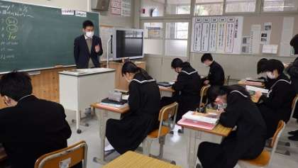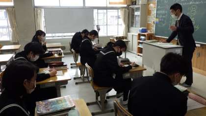 "Let's make a survey"調査をする単元です。テーマは「稲中生はどんなことに興味をもっているのか」 授業初めに基礎基本を徹底する時間をとっています。