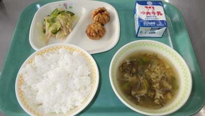 本日の献立は「ごはん、揚げパオズ、バンサンスー、もずくかき玉汁、牛乳」計832kcalでした。本日もとっても美味しかったです。ごちそうさまでした!!