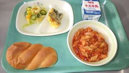 本日の献立は「ツイストパン、キッシュ、かんきつサラダ、ペンネのトマト煮、牛乳」計80kcalでした。どれも大変美味しかったですが、ペンネのトマト煮は最高でした!ごちそうさまでした!!