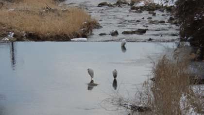 本日から2月です。久しぶりに暖かくなる予報ですが、今朝はー8度。とても寒いです。学校の敷地内を流れる黒田川にサギが3羽やってきました。もう少し互いに近くに寄ってほしいなあと思っていたら、気持ちが通じたのか、寄ってくれました。本日も何かいいことがありそうです。