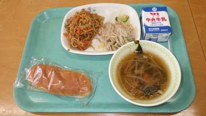 本日の献立は「米粉パン、やきそば、もやしのナムル、五目スープ、牛乳」計772kcalでした。生徒に大人気のやきそば、とっても美味しくいただきました。ごちそうさまでした!!