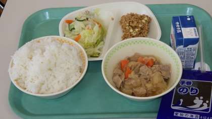 本日の献立は「ごはん、チーズ納豆、手巻きのり、甘酢あえ、肉じゃが、牛乳」計855kcalでした。本日は、「豊田ブランドの日」でした。ごはん・・・お米(大地の風)、にくじゃが・・・ぶた肉(とよたひまわりポーク)、納豆