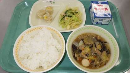 本日の献立は「ごはん、コーンしゅうまい、バンバンジー、八宝菜、牛乳」計774kcalでした。中華の日は生徒も大喜びです。たいへんおいしくいただきました。ごちそうさまでした!!