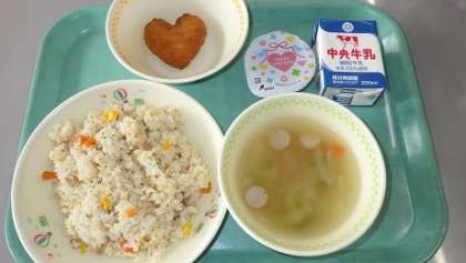 本日の献立は「ピラフ、ハート型コロッケ、ベジタブルスープ、豆乳チョコプリン、牛乳」計810kcalでした。とっても美味しくいただきました。さあ、明日からのテストに向け、もうひと踏ん張りです。がんばれ!稲中生!!