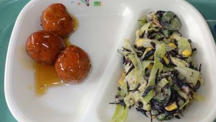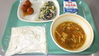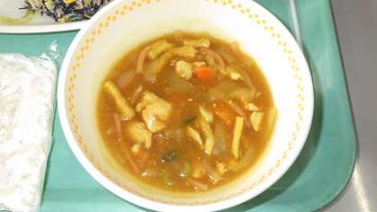 本日の献立は「カレーうどん、愛知のれんこんつくね、ひじきサラダ、牛乳」計832kcalでした。給食の時間が近づいてくるとカレーの香りが漂い、待ち遠しくい感じました。たいへん美味しくいただきました。ごちそうさまでした!!