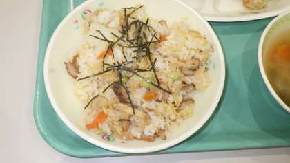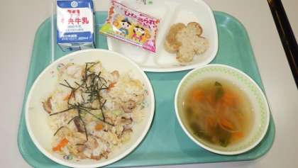 本日の献立は「ちらしずし、豆腐ハンバーグ、すまし汁、ひなあられ、牛乳」計764kcalでした。本日は「ひなまつり献立」でした。たいへん美味しくいただきました。ごちそうさまでした!!