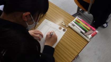 確率の学習の続きです。本時は10円玉を100回投げ、表、裏が出る確率を実験しました。盛り上がりました。