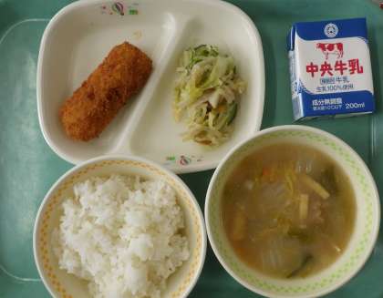 イカフライのレモンソースがけ ごはん 牛乳 ポリポリサラダ 味噌ちゃんこ汁です。