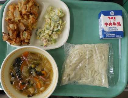 五目あんかけうどん 小エビのかき揚げ ささみのごまマヨ和え 牛乳です。美味しくいただきました!おなか一杯です。