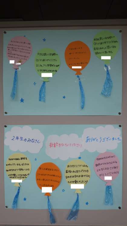 2年生の教室前の掲示板に1年生からのお礼の手紙があります。