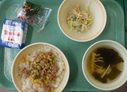 カツオのそぼろ丼 ごぼうサラダ 若竹汁 牛乳 かしわ餅です。今日も美味しい給食ありがとうございます。ごちそうさまでした。