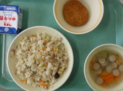 本日の献立 きんぴらピラフ キャベツ入りミンチカツ ポトフ 牛乳 です。