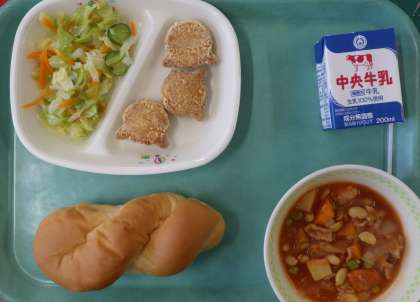 ポークビーンズ イタリアンサラダ たこナゲット ツイストパン 牛乳です。いつもおいしい給食をありがとうございます。