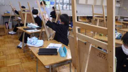 イーゼルスタンドを使用して、靴のデッサンを行いました。自分の思いが伝わる構図を考えて描いていきます。