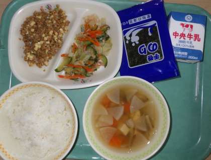 チーズ納豆 和風サラダ 八杯汁 手巻のり ごはん 牛乳 納豆巻きにして美味しくいただきました。ごちそうさまでした。