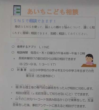 「電話での相談は苦手だな」と思っている生徒向けにLINEを使って相談ができるところがあります スクールカウンセラーよりその紹介がありました。対象者は公立小中学校の小学4年生から中学3年生までです。チラシを生徒に配付しました。