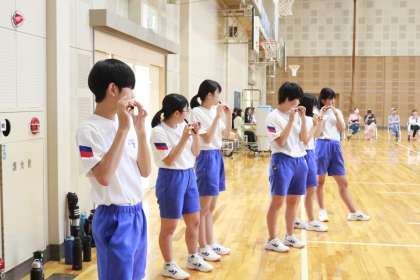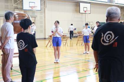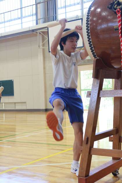 稲武地区に古くから伝わり、その伝統継承につとめられている地域の方を講師としてお招きし「稲武廻り太鼓」を生徒全員が学ぶ機会がありました。小学校で体験したり、住んでいる地区で練習したりする生徒も多く、また、昨年度の文化祭でも披露したこともあり意欲的に練習に参加することができました。あと2回ほどこのような機会を設け、秋にはその成果を発表したいと考えています。