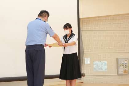手をつかまれたとき、どうすれば手を払うことができるのかを教えていただき練習をしました。お礼の言葉のあと、模範となる生徒への表彰「全校生徒表彰」を警察の方からしていただきました。