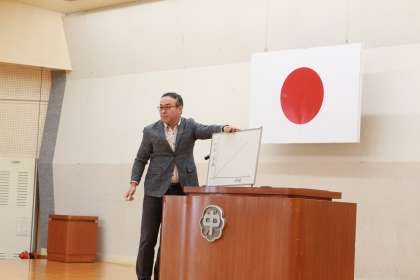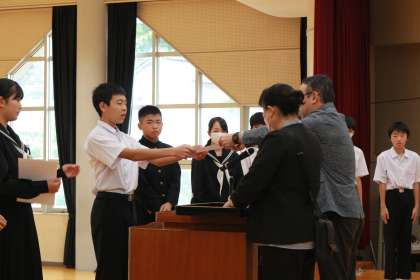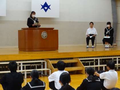 いよいよ後期がスタートしました。各学年の代表者が、今までを振り返り、後期に向けた抱負を発表しました。生徒会役員の任命式や表彰式も併せて行いました。