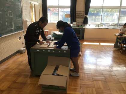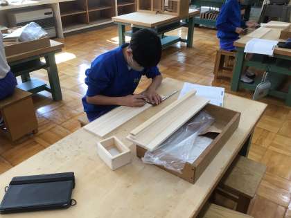 木工作品の制作を行っています。今日はけがきです。長さを間違わないようによく考えて行います。できているかどうか先生に確認してもらっています。