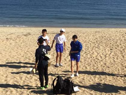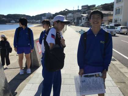 ウォークラリーの途中で、篠島中の子たちと出会い、一緒に島を歩きました。