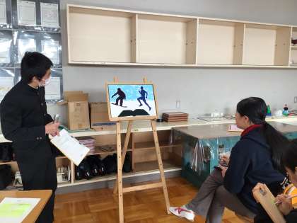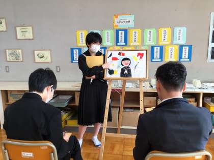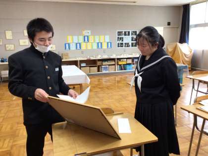 自画像の鑑賞家です。先生方も招いて行いました。力を入れたところや工夫したところを伝えたり、質問に答えるなど充実した取り組みとなりました。