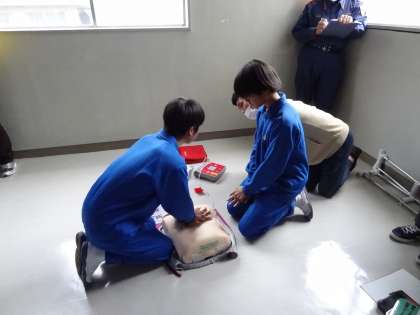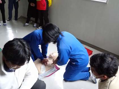 緊急時におけるシミュレーショ訓練」を行いました。消防署の方に来ていただき、活動の様子を見ていただきました。今回は階段踊り場で急に倒れこんでしまった友人の対応訓練です。訓練後は意見発表と消防署員の方から助言をいただきました。