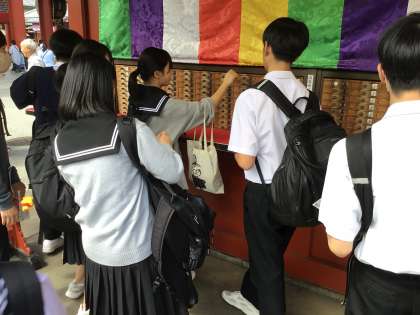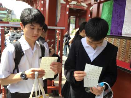 おみくじをひいています。 大吉の人もいますが、凶の人がおおそうです。