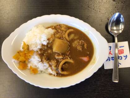 今日の昼食は、イカカレーライスでした。1回おかわり券が付いています。