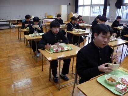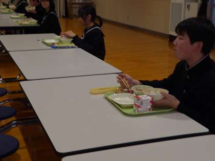 いつもは多目的ホールで全校会食をしていますが、感染症対策として部屋を分けたり、より間隔をとって一方方向を向いたりしての会食に切り替えています。