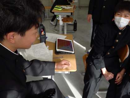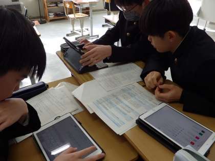 タブレットを使って情報を集めたり、級友と相談したりしながら、案を考えています。