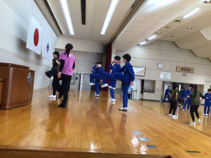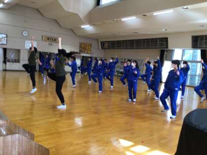 中京大学の先生と学生がダンスの授業にいらっしゃいました。始めに音楽に合わせて様々なステップで体を動かした後、KーPOPの曲に合わせてA・Bの二通りの振り付けから各自選んでダンスを練習しました。授業の最後には、それぞれのグループで発表しました。とても短い練習時間でしたが、どちらの発表もとってもさまになっていて、かっこよく踊ることができました。